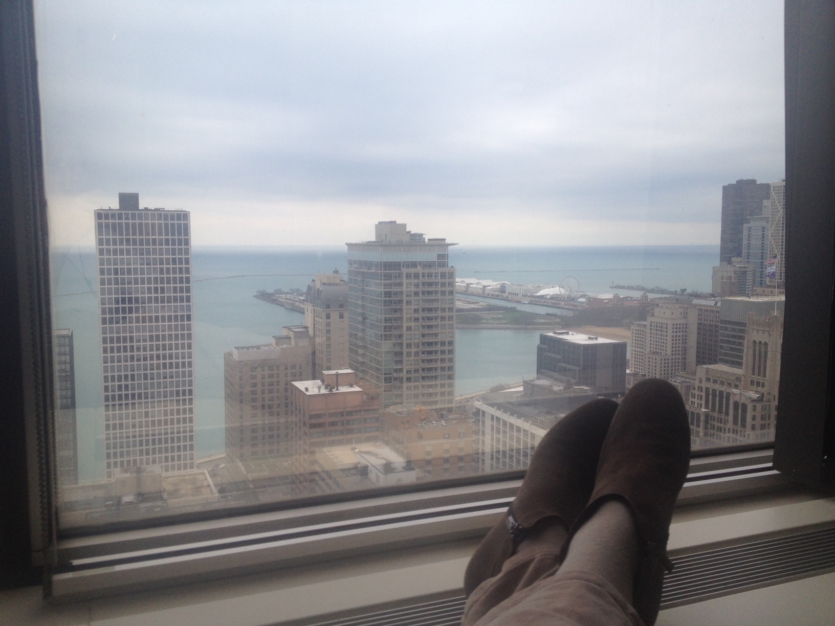 Like last week, my office today has a view of Lake Michigan. (I don’t have a permanent office yet so I’m a bit of a gypsy here).  When I walked in and saw the water,  I felt calmer. There is something about water. I never feel alone when I am near it. My desk faces the door so I’ve been writing looking out the window, laptop on my thighs, feet up on the air vents. The water is calm with dappled waves. It is overcast. spittles of water on the window come and vanish. Two boats out on the water. I’m looking out over rooftops, mostly modern buildings, mostly commercial though a few have  stacks of empty balconies and a few rooftop gardens, The Navy Pier carousel wheel to the south. A crow sails past the window and disappears.